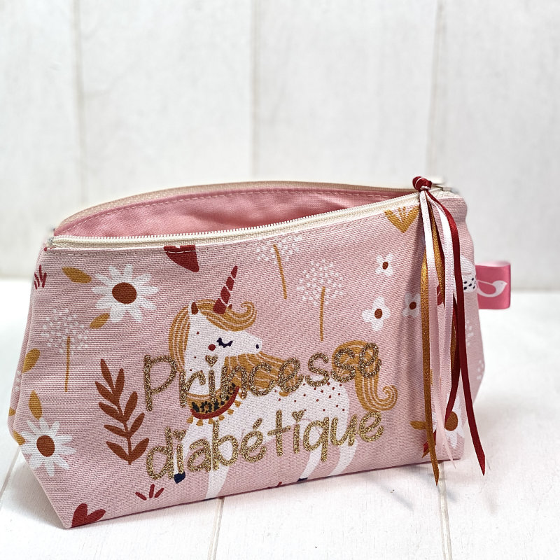 J'ai créé et cousu cette trousse pour nous, les diabétiques, elle est parfaite pour ranger tout le petit matériel: Lecteur FreeStyle Libre, stylos à insuline, commande de pompe, pods, boîte à sucre.... La poche intérieure servira à ranger les bandelettes, les aiguilles..... Doublure tissu coton enduit, la trousse est fermée par un zip Idéale pour glisser dans le sac à main ou la valise lors de déplacements Lavage 30° Pas de repassage sur le tissu enduit, ni sur le texte Largeur 18cm, hauteur 14,5cm, profondeur 7cm
